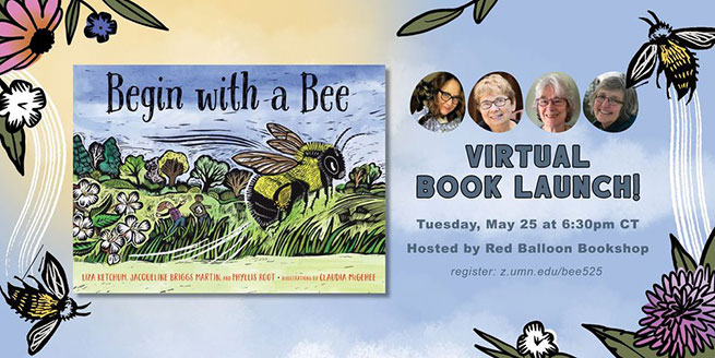 Join Jacqueline Briggs Martin, Claudia McGehee, Phyllis Root, and me for our virtual Book Launch for Begin with a Bee on May 25, 2021, beginning at 6:30 pm CDT, hosted by The Red Balloon Bookshop from Saint Paul, Minnesota. Please order an autographed copy from the bookstore; we have each signed bookplates to go in your first edition.